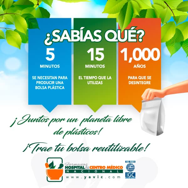 A partir del 1ero de julio de 2019 y en cumplimiento de la Ley No.1 del 19 de enero de 2018 Se elimina en Farmacias Yavic, la entrega de bolsas plásticas. Agradecemos atender a esta normativa para el traslado de sus productos y medicamentos adquiridos en nuestros establecimientos. juntos por un planeta libre de plásticos.